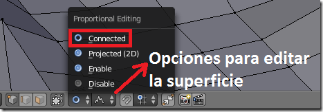 Esto nos da diferentes opciones para editar la superficie y teniendo el modo de edición por Vértices podemos seleccionar un vértice con Click Derecho y moverlo con la Tecla G, aquí se nos mostrará un círculo blanco que podemos aumentar o disminuir con la rueda del mouse y nos indicará por tanto el área que será afectada